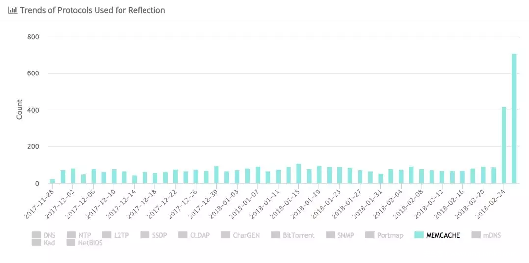 由于Memcache作为放大器数量稳定,近几天攻击开始陡增,且生成带宽极大