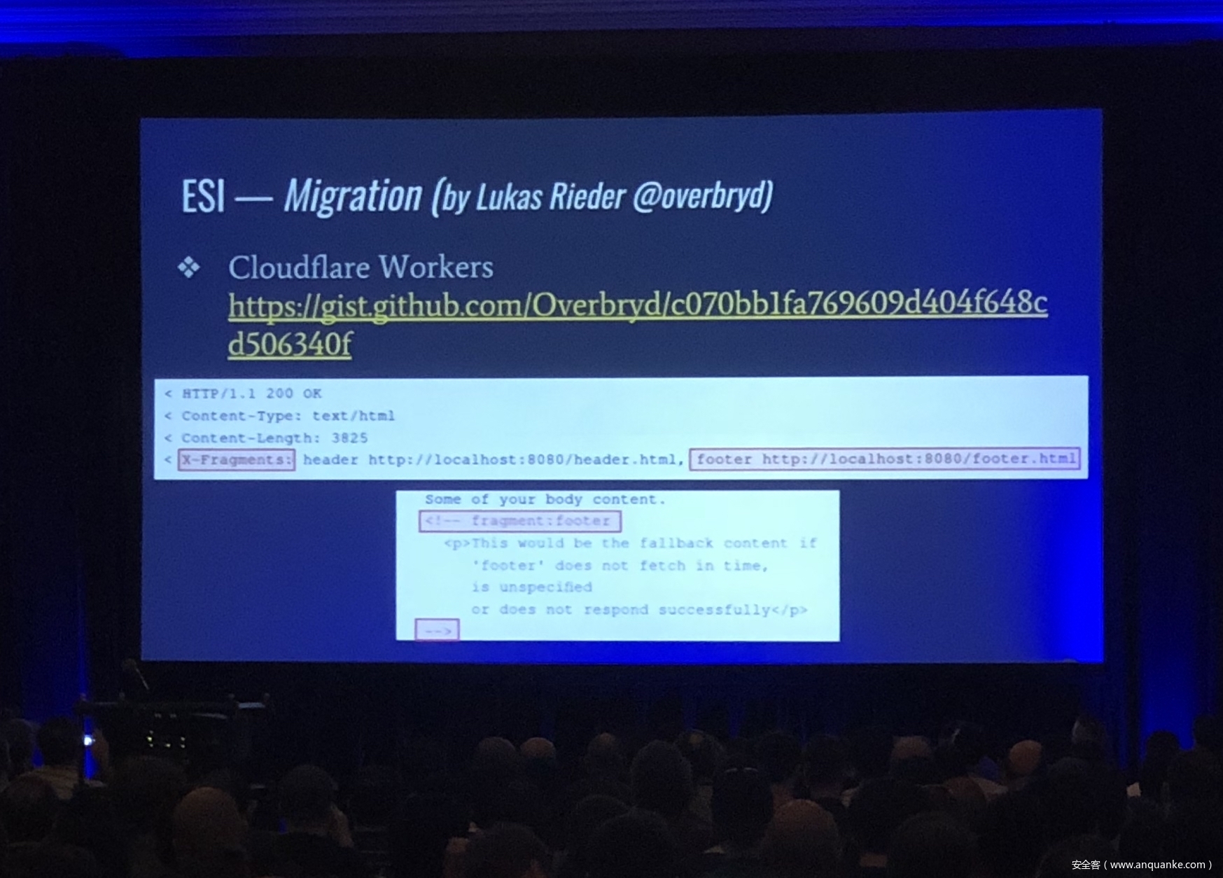 目前为止,受影响的厂商包括Akamai、Varnish Cache、Squid Proxy、Fastly、IBM WebSphere、Oracle WebLogic、F5以及各类语言解决方案(NodeJS和Ruby等)。在此次演讲中,我们首先会介绍跟ESI有关的内容,并利用这种攻击模型来演示攻击一些典型的基础设施。除此之外,我们还会对目前热门的ESI引擎安全性进行分析,并给出一些可行的缓解方案。