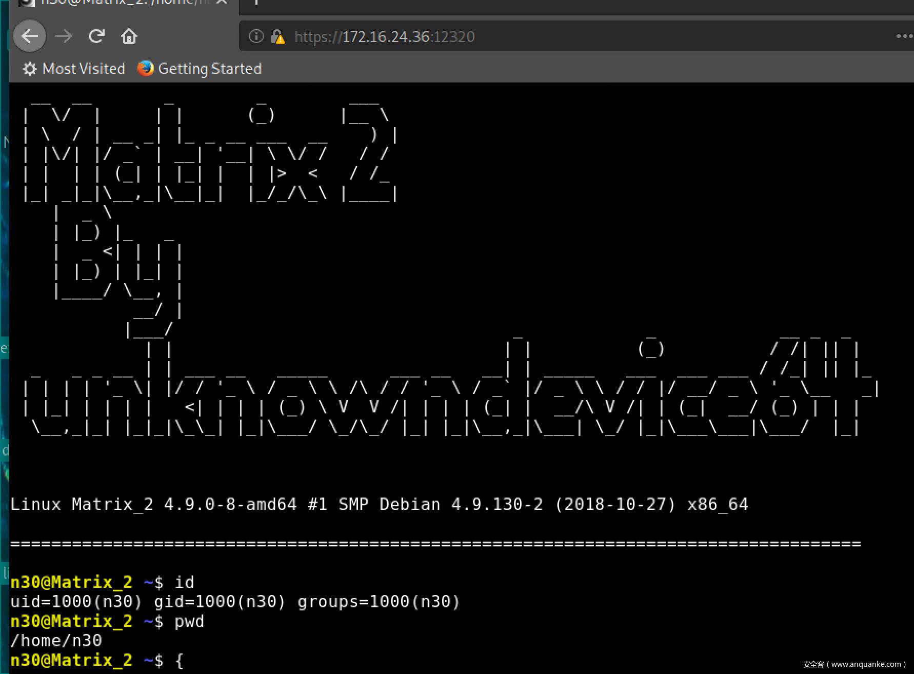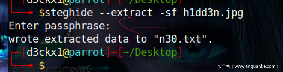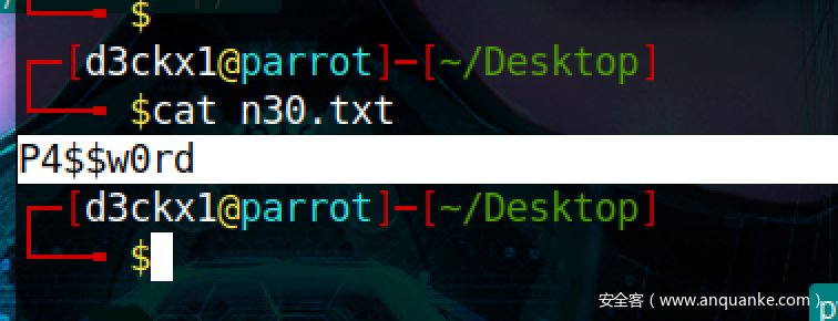 如上图中,我们使用 steghide 命令能分离被隐写的文件,但是需要我们输入密码,这里不知道大家有没有看到刚刚密码登陆成功后首页上 红色的 “n30”, 没错 密码就是它。。。然后我们就分离出来一个名为“n30.txt”,查看一下,如图: