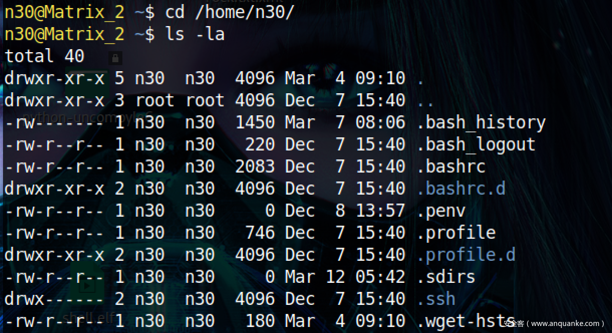 看到很多隐藏文件,大家以后实战的时候,记得一定一定要关注关注 “.bash_history”