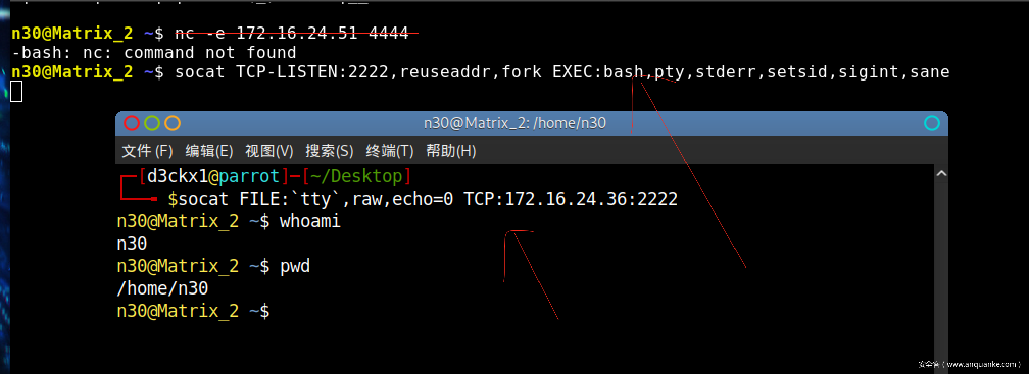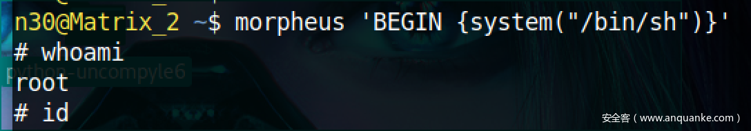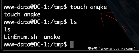 直接使用命令: find anqke -exec ‘whoami’ ; (注:命令结尾这个“;”必须要加)
