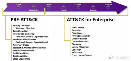 另一方面当前ATT&CK定义的细节更侧重于ATT&CK for Enterprise部分,前文说到,ATT&CK是构建了一套更细粒度、更易共享的知识模型和框架,网络攻击者的行为知识库,用来指导检测、防御的。 但PRE-ATT&CK的部分(即在未触达企业的边界之前的行为)定义的比较粗,基本都是计划、人员组织、开发测试等逻辑术语,但是这一部分往往是情报能力建设工作中最先需要关注的部分。