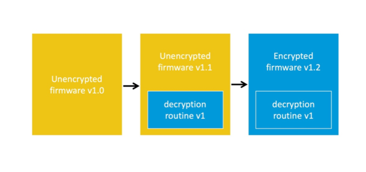 在原始发行版中设备固件已加密。厂商决定修改加密方案,发布未加密的过渡版本(v1.2),该版本中包含新的加密例程。