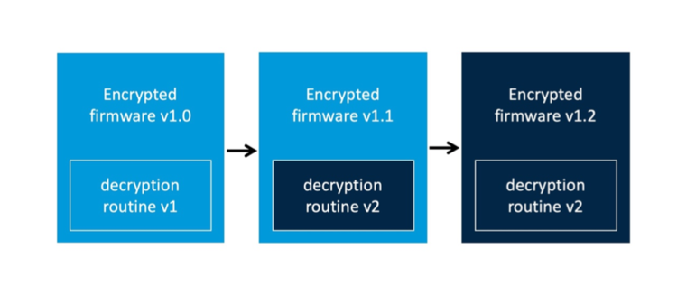 在这种场景中,我们可以从v1.1版固件获得加密例程,使用该例程来解密v1.2版的最新固件。