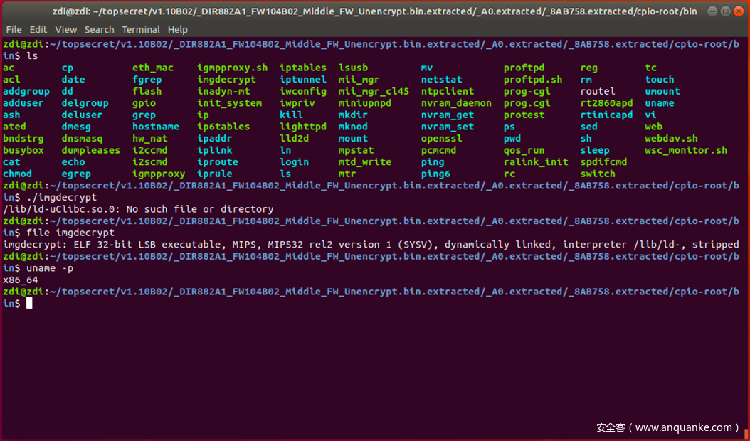 成功提取文件系统后,我们可以开始研究固件更新过程,判断固件的解密机制。幸运的是,快速浏览文件系统后,我们在/bin目录中找到了比较有趣的一个二进制文件:imgdecrypt。