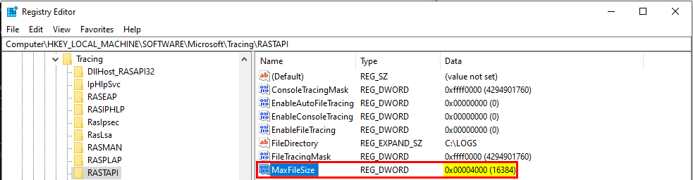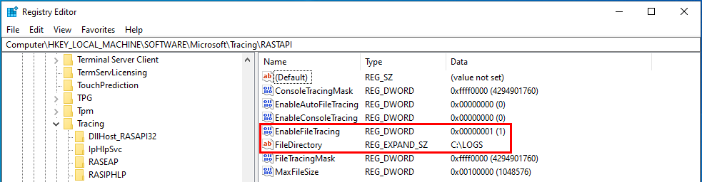 Windows系统中,服务或者模块会关联某些注册表项,其中每个键都包含6个值(即具体的设置信息)。这里我们主要关注其中3个值:EnableFileTracing(启用/禁用“跟踪”功能)、FileDirectory(设置输出日志文件的具体位置)及MaxFileSize(设置日志文件的最大文件大小)。