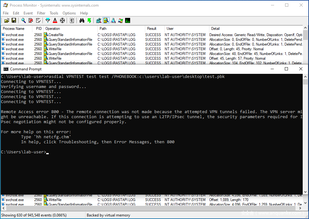 现在,如果我们希望目标服务开始写入该文件,就必须生成某些事件。这里最简单的一种方法就是使用rasdial命令,配合PBK文件来初始化任意一个VPN连接。
