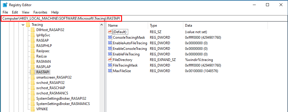 为了演示方便,下文中我将以RASTAPI模块为例,这也是我利用代码中用到的模块。由于IKEEXT服务会用到该模块,因此我们可以通过启动任意VPN连接来触发事件日志行为。涉及到的相关注册表键值默认设置如下图所示,其他服务及模块也使用了完全相同的值。