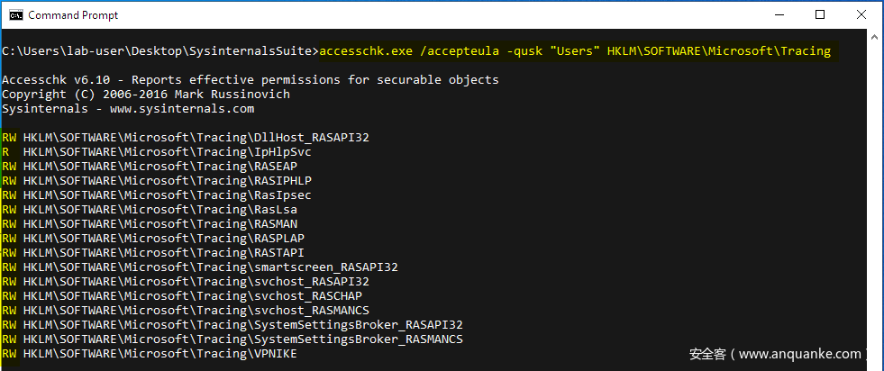 我们可以使用Windows Sysinternals工具集中的AccessChk工具,验证普通用户具备相关注册表项下几乎所有子项的的Read/Write权限: