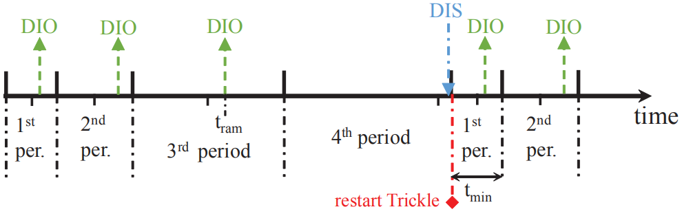 另外,来自希望加入网络的新节点的DODAG信息请求(DIS)消息也将被视为不一致的路由信息。在Trickle算法中,如上图所示,时间分为可变长度的周期。 DIO消息的传输安排在每个周期的后半段的随机时间tram中。直到tram,该节点都在无线信道上侦听不一致的路由信息,例如来自新节点的DIS消息。在时间tram中,如果节点未收到DIS消息,则它广播调度的DIO消息。然后,将下一个周期的长度加倍,直到达到最大长度。否则,当前周期被中断并且调度的DIO消息的发送被终止,如它在图的第4周期内发生的那样,Trickle流算法再次从tmin开始。