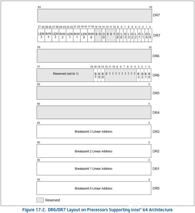 某些调试异常可能会清除第0-3位。处理器永远不会清除DR6寄存器的其余内容。为避免在识别调试异常时产生混淆,调试处理程序应该在返回中断的任务之前清除寄存器(除了应该设置的第16位之外)。