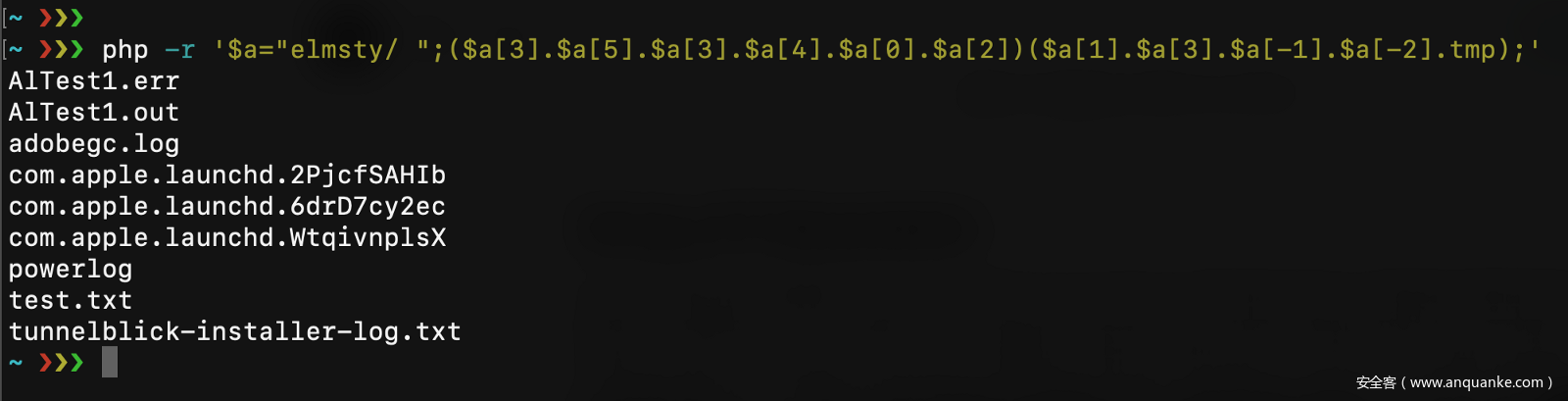 PHP中的每个字符串都可视为一个字符数组,并且可以通过语法$string[2] 或 $string[-3]来引用单个字符。这同时也是另一种绕过安全规则的方法。例如,仅仅使用字符串$a="elmsty/";,我就可以组成命令执行语句system("ls /tmp");