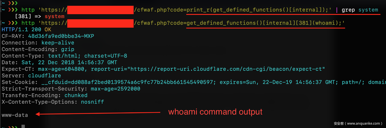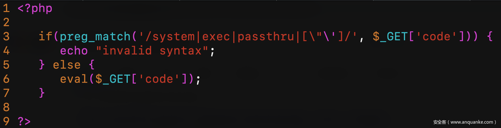 第二种是使用变量$_GET。如果我发送这样一个请求?a=system&b=ls&code=$_GET[a]($_GET[b]);,那么在代码执行中,$_GET[a]和$_GET[b]会被system和ls所替代,最终绕过引号的安全限制。