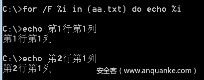 将delims设置为空格,是将每个元素以空格分割,默认只取分割之后的第一个元素。如果我们想得到第二列数据,就要用到tokens=2,来指定通过delims将每一行分成更小的元素时,要取出哪一个或哪几个元素:for /F "tokens=2 delims= " %i in (aa.txt) do echo %i