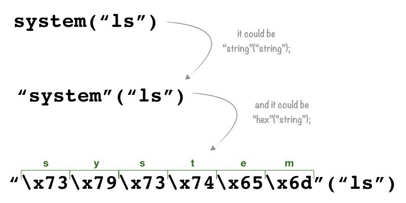 这意味像$var(args);和"string"(args);等表现形式等同于function(args);如果可以通过使用变量或字符串去调用函数,那更进一步,我们就可以使用不同的进制序列去代替原函数名。以下是一个例子,目标过滤了system之类的敏感函数,导致无法利用代码执行: