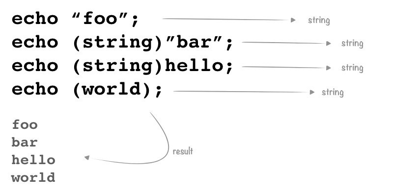 幸运的是,在PHP中字符串并不总是伴随着引号。在PHP中,我们可以主动声明它的类型,像例如$a = (string)foo;在这种情况下,变量$a就是字符串“foo”。此外,还可以使用圆括号,如下图: