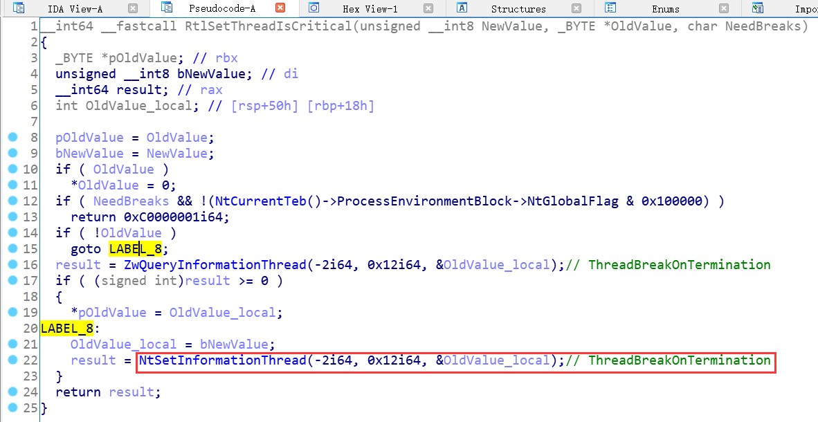 大家可以尝试着分析下NtSetInformationProcess或者NtSetInformationThread设置进程或线程的Critical属性时,设置的是哪里。思路如下: