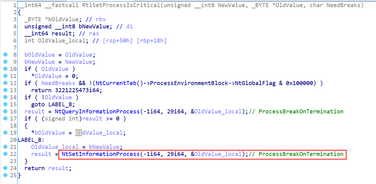 NTSTATUS NTAPI RtlSetProcessIsCritical (IN BOOLEAN NewValue,OUT PBOOLEAN OldValue OPTIONAL,IN BOOLEAN NeedBreaks);