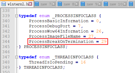 THREADINFOCLASS和PROCESSINFOCLASS这两个枚举常量,官方头文件公布出来的如下: