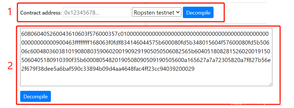 本篇我们主要来讲智能合约opcode逆向,推荐的在线工具为Online Solidity Decompiler。该网站逆向的优点比较明显,逆向后会得到合约反编译的伪代码和反汇编的字节码,并且会列出合约的所有函数签名(识别到的函数签名会直接给出,未识别到的会给出UNknown),使用方式为下图: