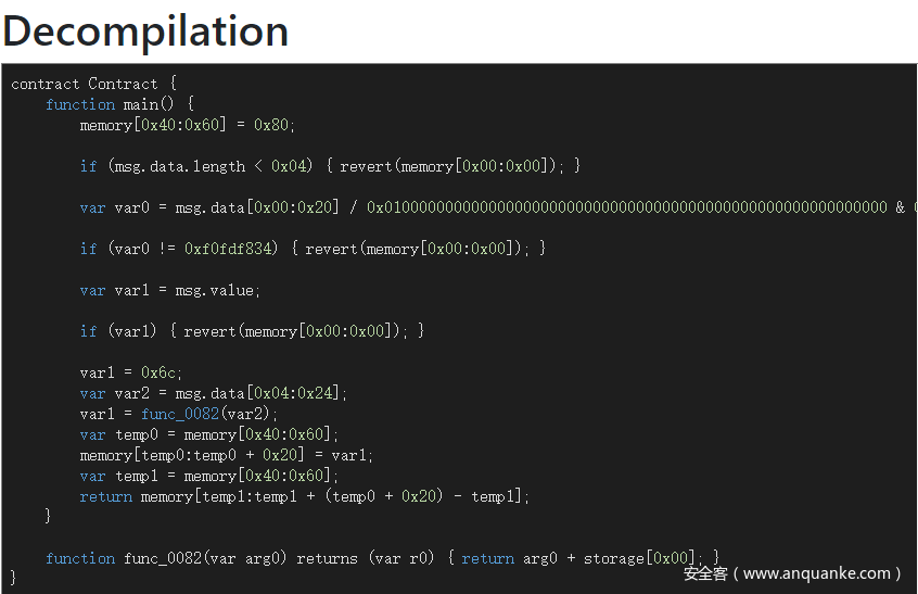 先来看一份简单的合约反编译,合约代码如下: