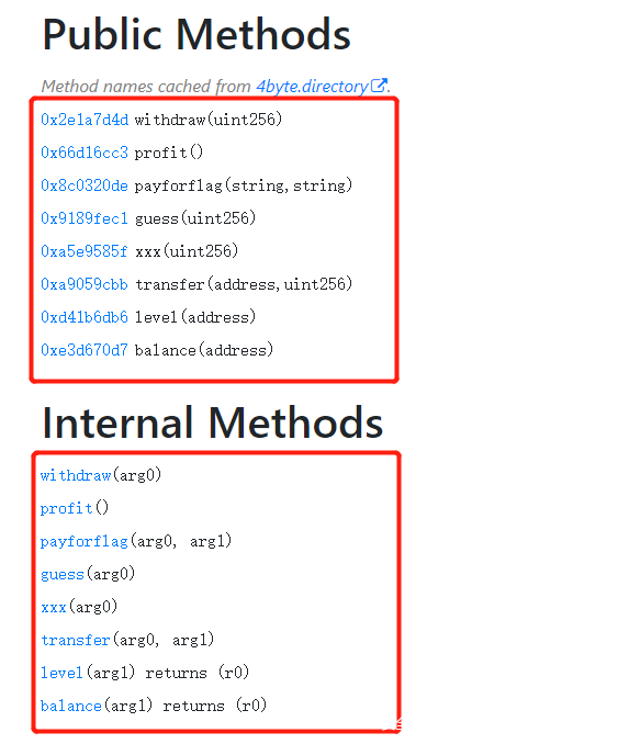 该反编译合约中,需要判断分析的点为合约中的逻辑函数和主函数main()的相关判断。逻辑函数(withdraw,profit,payforflag,guess,xxx,transfer)中和主函数main()需要关注的点为: