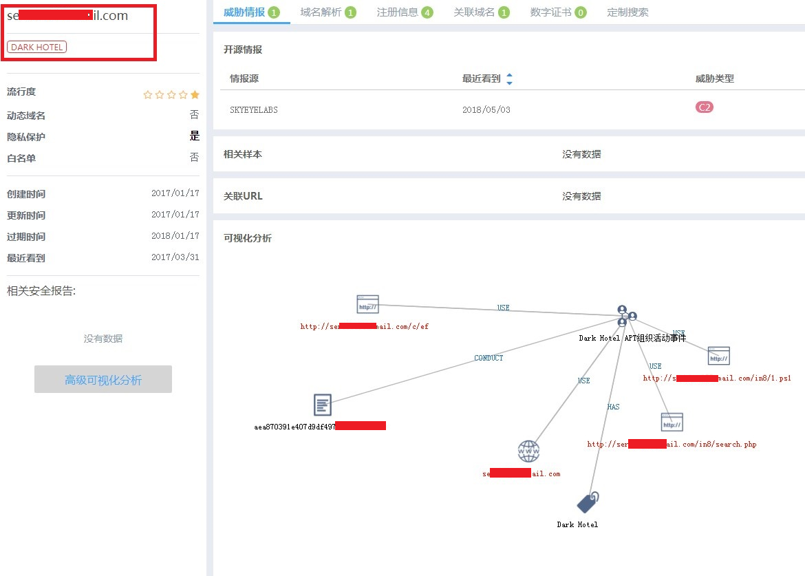 习惯性的使用360威胁情报中心数据平台搜索样本中用于下载恶意脚本的两个域名,可以看到相关域名正是360威胁情报中心内部长期跟踪的Darkhotel APT团伙使用的域名,相关域名早已经被打上Darkhotel的标签: