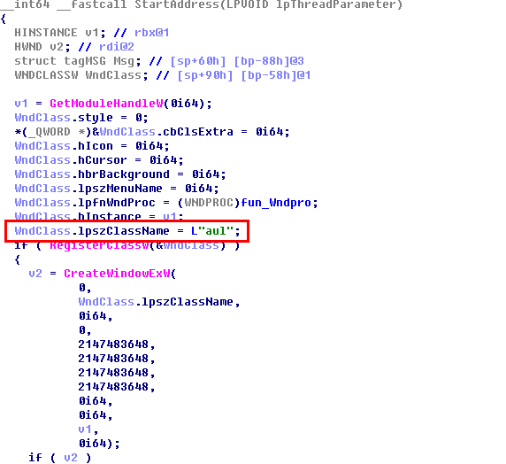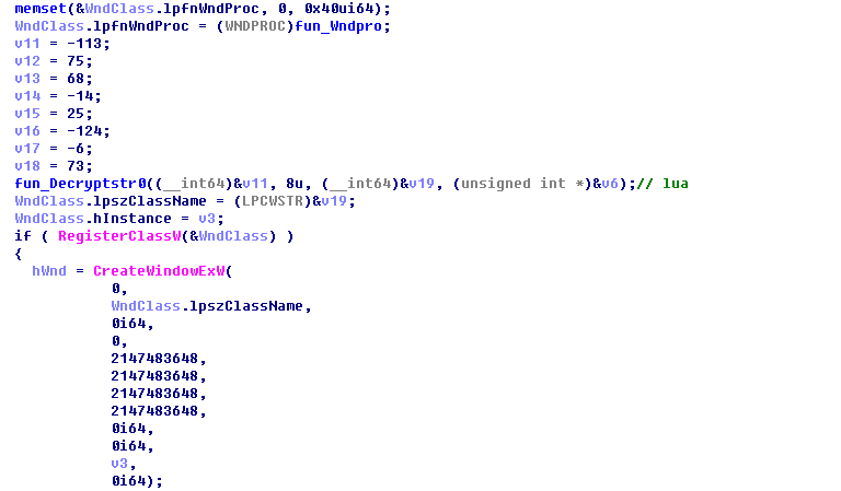 随后在窗口线程里创建一个名为lua的窗口,并设置对应的lpfunWndProc函数,该函数为对应的文件窃取的主函数。