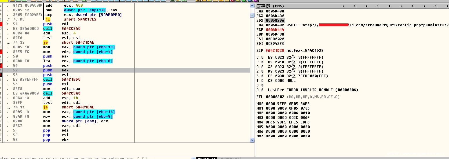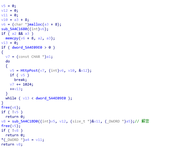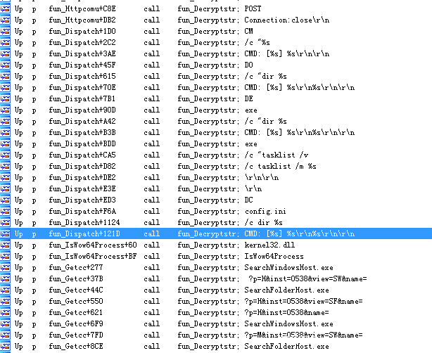 最后进入fun_shell_Dispatch函数,该函数通过POST的方式提交用户信息(地址:http://******rld.com/strawberry322/config.php?p=H&inst=0538&name=180322-16),并返回对应的攻击指令,且提交数据的前八个字节预留,用于校验:
