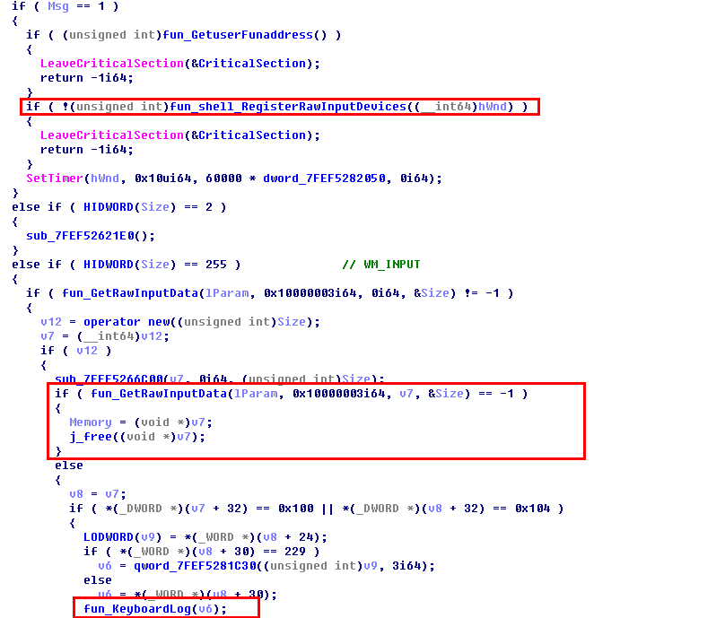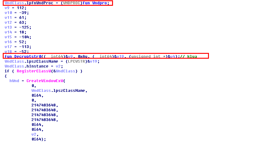 其中包含了对应的键盘记录存放目录(%ALLUSERSPROFILE%\\AU50FE1D),及记录的文件类型,其同样会创建一个名为klua的窗口,并设置对应的lpfunWndProc函数,该函数为键盘记录主体: