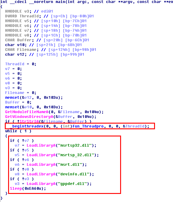 最初版本的Loader主函数功能十分清晰,线程中执行主要的Loader功能,并通过LoadLibrary加载模块DLL: