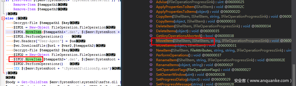 再次下载回来的PowerShell脚本也是经过混淆的,去混淆分析整理后的功能主要是绕过UAC后去下载msfte.dll到系统的system32目录下,下载NTWDBLIB.DLL文件到系统的system32目录下,通过cliconfg.exe白利用加载NTWDBLIB.DLL来修改msfte.dll的宿主服务WSearch成自动开启状态,实现msfte.dll的持久化驻留主要功能如下: