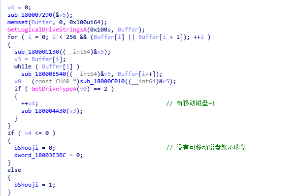 样本运行之后会有专门的线程用于监控可移动磁盘(DRIVE_REMOVABLE)的插入,并窃取其中的重要文件: