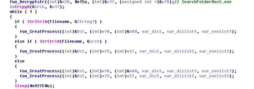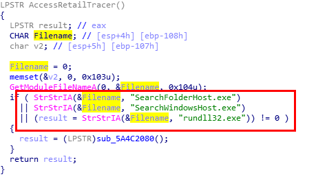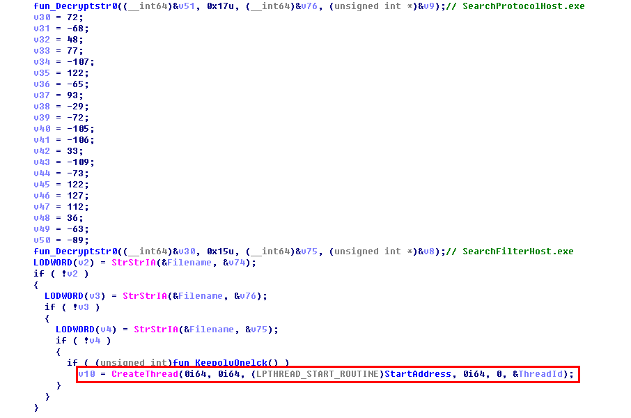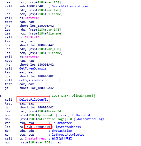 下载回来的msfte.dll成功释放到system32目录后,重启系统(随之启动WSerch服务)会默认加载这个DLL文件,实现自启动,代码中会判断是否是以下几个进程加载该DLL,如果是才会执行恶意代码: