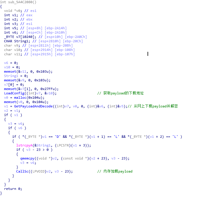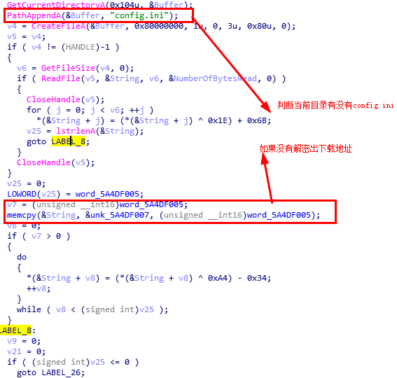 LoadConfig函数会先判断同目录下有没有Config.ini,如果没有,就会从自身解密出Payload的下载地址: