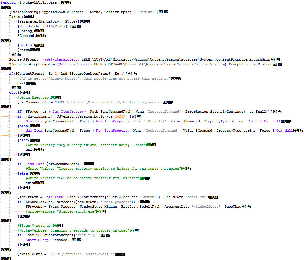 样本首先通过修改注册表HKCU:\Software\Classes\exefile\shell\runas\command的值,指向需要运行的进程路径(PowerShell),再运行sdclt.exe触发执行起来的进程以实现Bypass UAC: