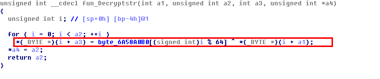 第一类通过一个预置的64字节的字典异或获取字符串的值,该类解密算法主要用于解密动态函数名及部分重要的字符串: