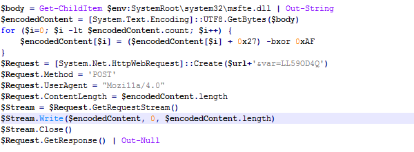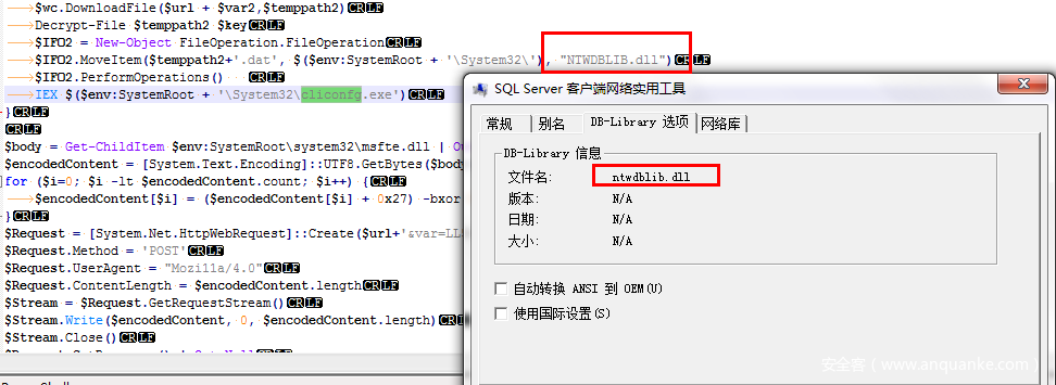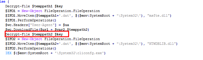 Bypass UAC后的PowerShell脚本会伪装UserAgent后去下载msfte.dll和NTWDBLIB.DLL这两个文件,然后通过AES解密到%temp%目录下,密钥为’Lq5846yGptowMcuLyQBcdw+vgnKl7aA0lTBUV4QkShs=’: