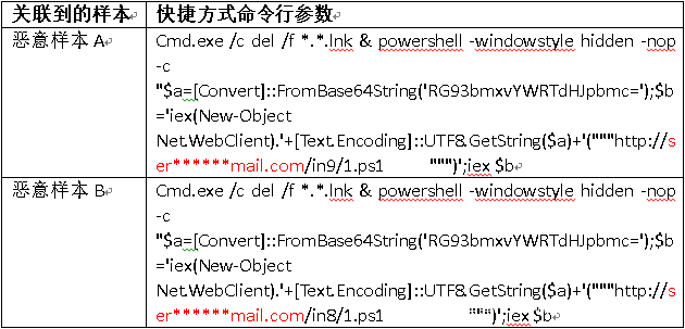 进一步分析使用Lnk快捷方式执行恶意代码的样本,可以看到都使用了完全一致的命令行参数和代码: