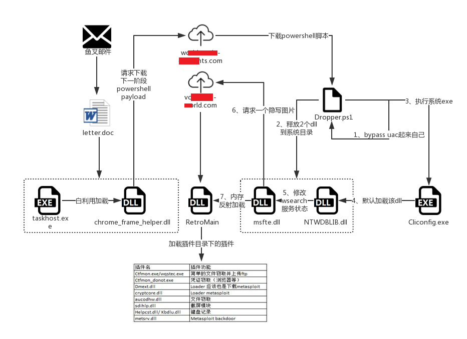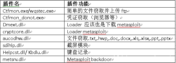样本的主控模块(RetroMain)除了实现远程命令处理等功能以外主要以插件形式执行主要的模块功能,样本使用了多个插件,主要的插件功能如下: