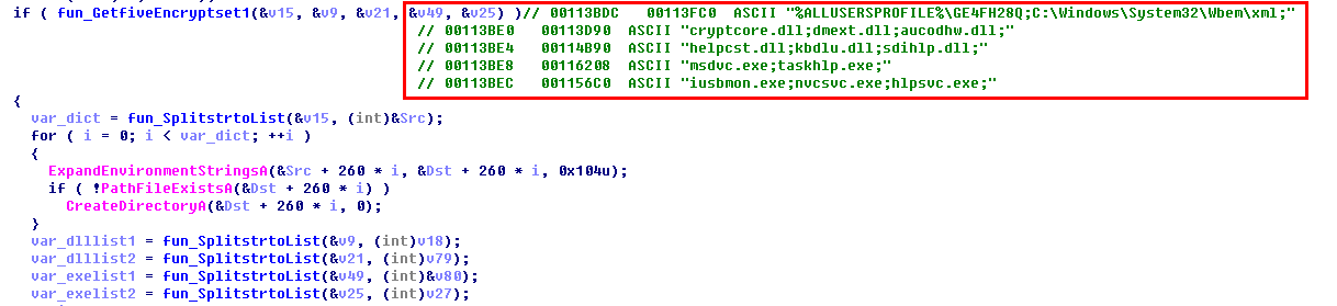 主控DLL启动一个线程并通过上述的第二类解密算法获取对应的插件名及插件对应的目录,插件路径为%ALLUSERSPROFILE%\GE4FH28Q,支持的插件如红框所示: