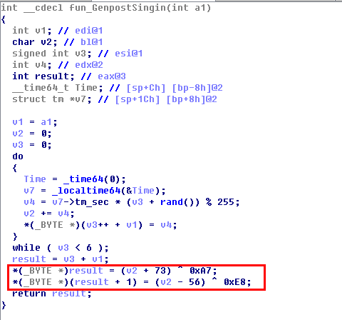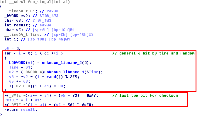 singal前6位的数据通过时间和随机数相加取余获得,第7、8位为前6位和的校验值: