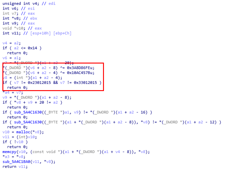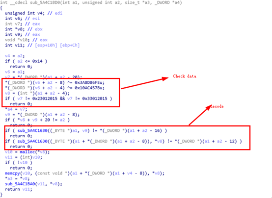 解密函数中会首先校验下载数据的合法性,然后再执行解密: