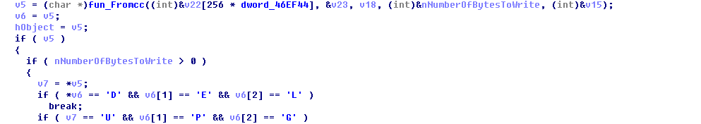 下载服务器返回的其他模块并加载,如下所示,加载器校验对应的下载模块是否以UPG或DEL开头,最新版本的校验头为DLL: