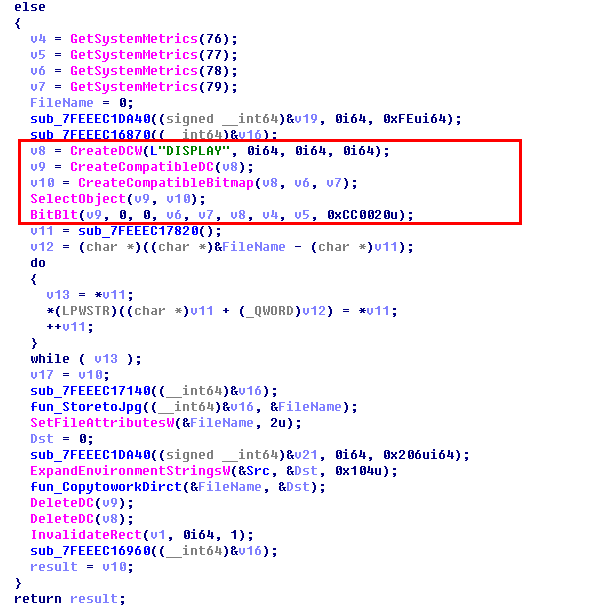 主函数中通过调用BitBlt抓取屏幕截图,并通过GDI函数保存成JPG文件。