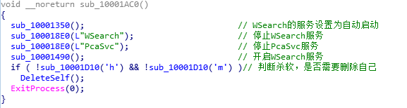 该DLL的主要作用是把WSearch服务(mstfe.dll的宿主服务)设置成自动启动状态,这样mstfe.dll会随系统启动而启动,然后重启服务,加载劫持的DLL文件: