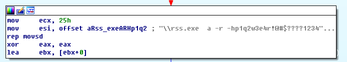 通过cmd.exe /c dir /x /s /a遍历目录文件信息,获取指定后缀的文件doc,xls,txt,ppt,eml,doc,并通过WinRAR加密压缩,对应的密码为:p1q2w3e4r!@#$????1234****: