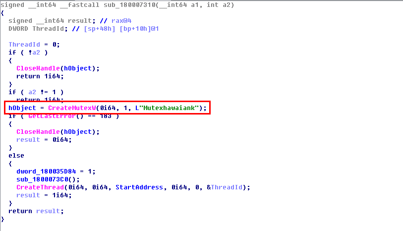 sdihlp.dll为该样本使用的截屏模块,模块启动后创建互斥量Mutexhawaiank,之后开启主线程: