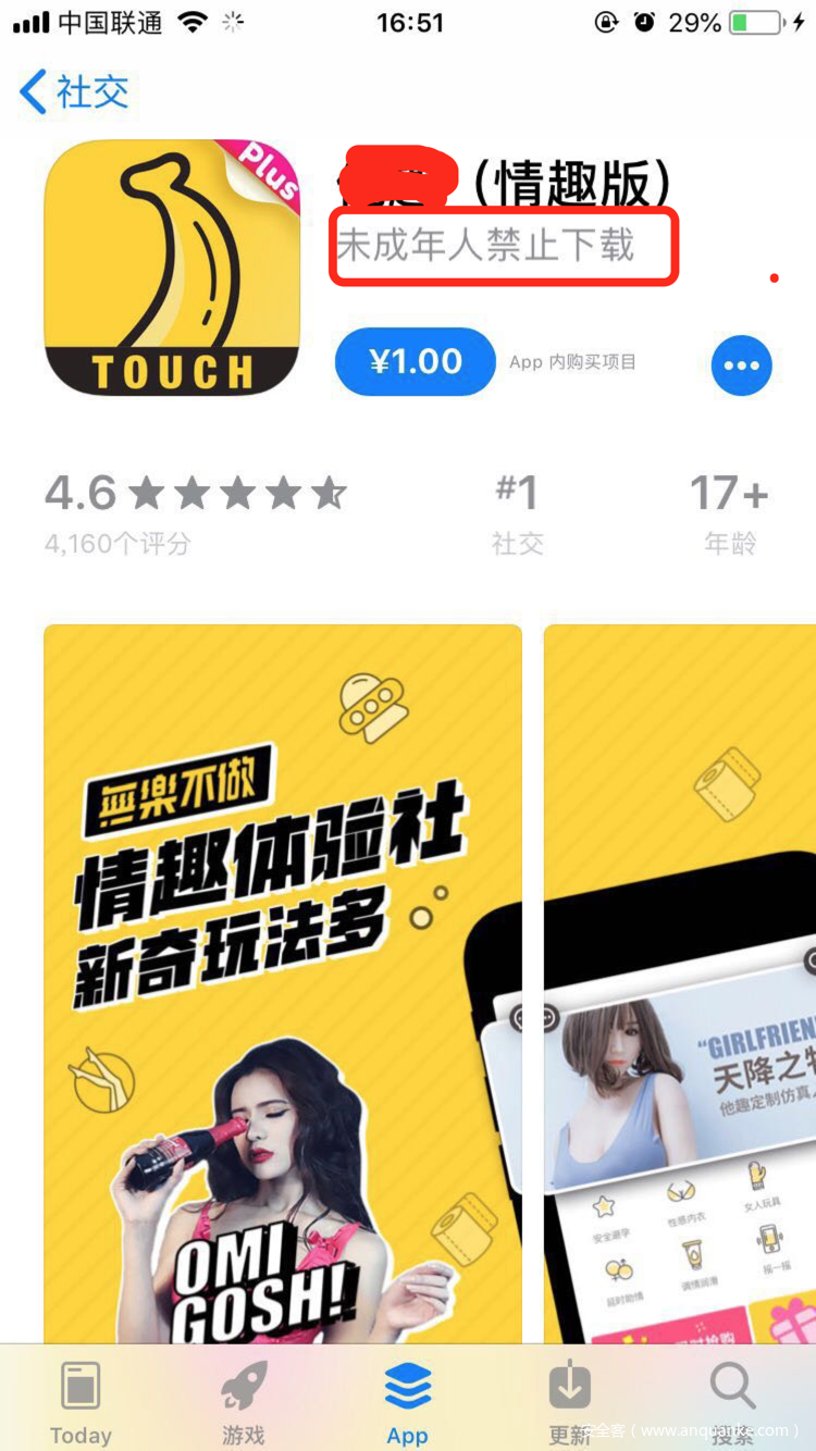 社交栏推荐的第一个app是款付费软件,收费1块钱,上面标注着醒目的“未成年人请勿下载”。
